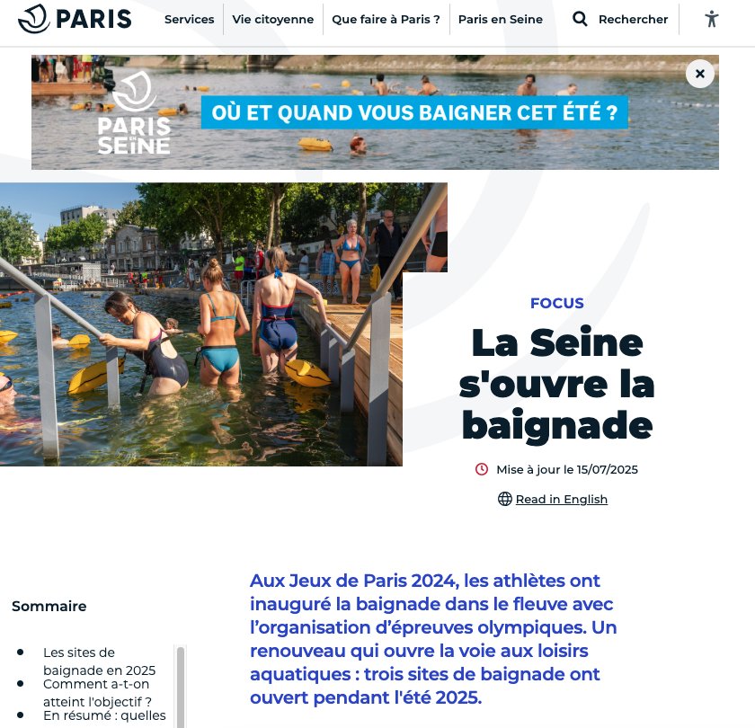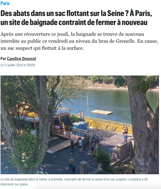 巴黎市政府也果斷關閉了15區那邊塞納河游泳地方。現在表示,每天都在進行水質檢測。等待最後檢測結果。
