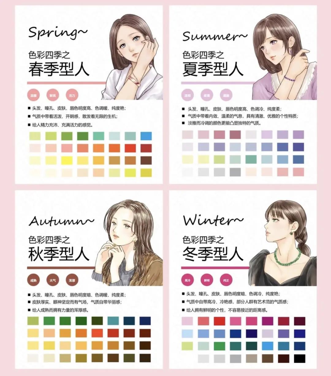 這句話裏面的春夏秋冬,不是什麼氣候知識,而是近年來被不少明星、網紅打卡過的“色彩診斷”。它主要通過分析個人膚色、髮色和瞳孔顏色之間的關係,再結合色彩學從而劃分出不同的類型,大的分類是4類——春季型、夏季型、秋季型、冬季型。