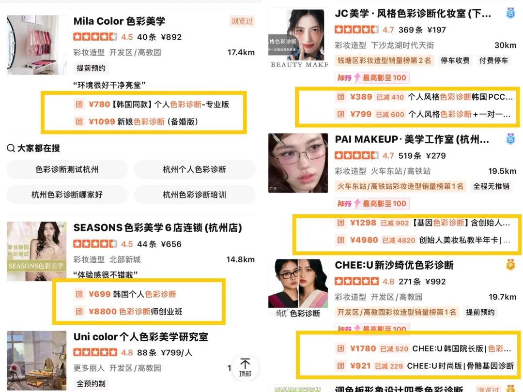 在大眾點評中搜索“色彩診斷”“色彩測試”可以看到,僅在杭州地區,已經有超過40家店鋪提供相關服務,售價在299—1399元不等,其中799元的價格是較為集中的價格區間。