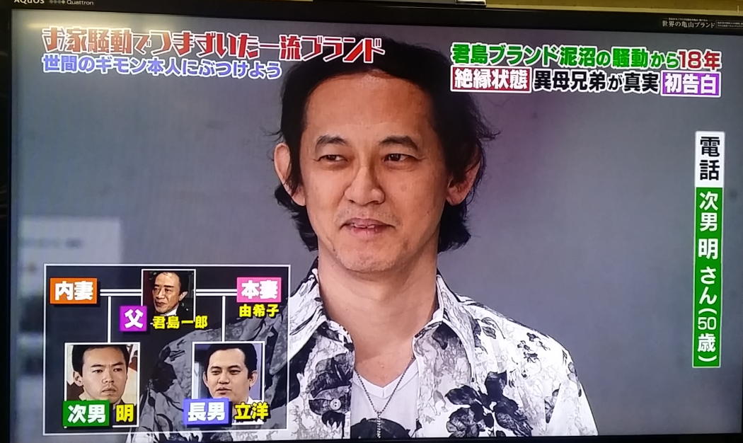 儘管他留下遺言,指定與情婦所生的婚外子——君島譽幸(後改名為君島明)為KIMIJIMA品牌的繼承人,但正室由希子與長子立洋對此表示強烈不滿。