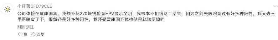 還有一位浙江網友自費檢查HPV,顯示全陰,她不相信檢查結果,因為之前在醫院檢查過,有多項陽性。後來她跑去三家醫院複查,果然顯示多項陽性,她就懷疑: