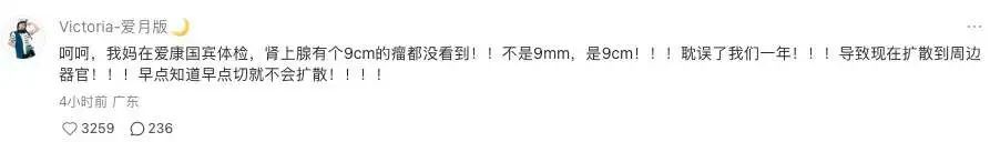 一位廣東網友自述,其母親在愛康國賓體檢沒發現腎上腺腫瘤,後來因為車禍入院檢查,意外發現右腎有大陰影,腫瘤達9cm。