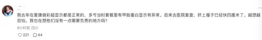 四川網友去年在愛康做彩超,報告顯示均無異常,當時套餐裏有甲胎蛋白檢測,顯示有異常。這位網友不放心,去醫院複查,發現,肝上瘤子已經快四釐米了。