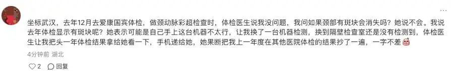 最讓狗蛋詫異的是一位武漢網友的遭遇,他去年12月體檢做頸動脈彩超檢查時,愛康體檢醫生説沒問題。(頸動脈斑塊一旦形成,通常無法自行消失)