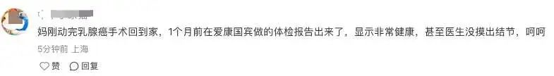 上海網友的母親剛動完乳腺癌手術到家,一個月前在愛康國賓的體檢報告出來了,無任何異常提醒,醫生沒有摸出結節。