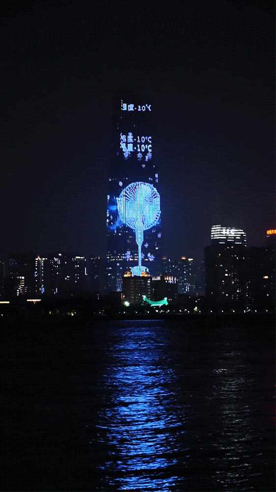 這次賽博風扇大賞中,長江燈光秀也來湊熱鬧,把電風扇“搬”上江畔高樓,“温度-10℃”和“漫天飛舞的雪花”組成無限循環的CP,涼爽的氛圍感管夠。