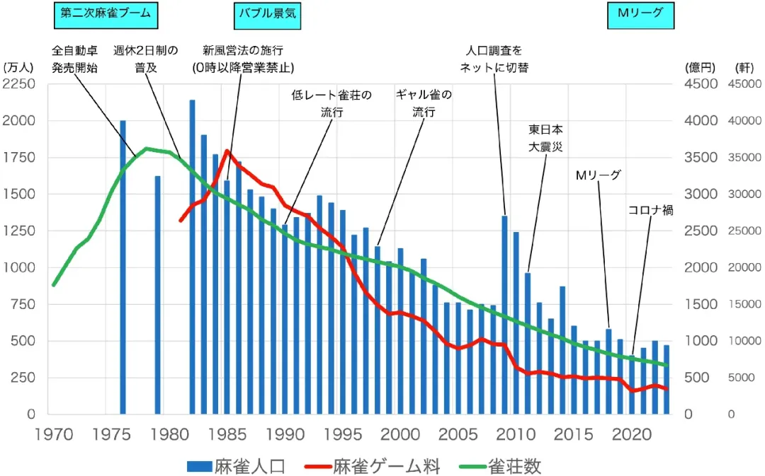 這樣的形象,使得日本麻將人口持續下滑——從1982年巔峯期時多達2140萬,降至2009年1350萬,到2016、2017年時就只剩500萬人(數據出自《日本休閒白皮書》)。需要指出的是,這裏説的麻將人口是指到雀莊(麻將館)付錢打麻將的人數。1986年時,打麻將的日本人每年平均花35700日元在雀莊打麻將,到2016、2017年時每年也平均只花5千日元。