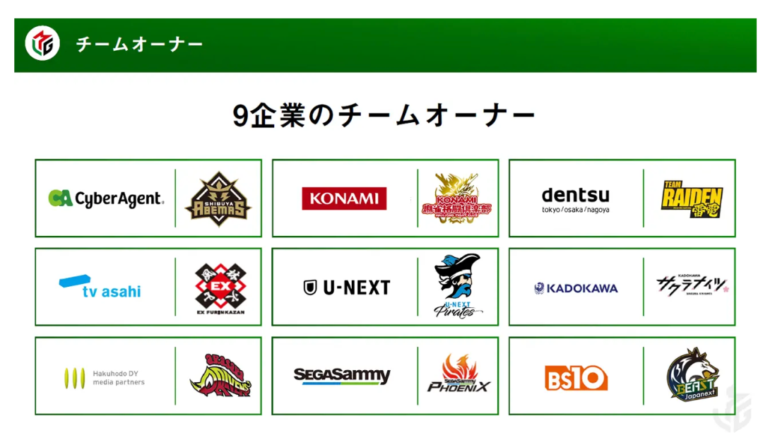 首個賽季,M聯賽一共有Cyber Agent、電通、博報堂(HAKUHODO DY Media Partners)、朝日電視台(tv asahi)、科樂美娛樂(KONAMI)、世嘉颯美控股(SEGA Sammy)、U-NEXT七家公司加入其中,組成七傢俱樂部。後來,KADOKAWA和BS10新加入,形成了目前九傢俱樂部的格局。