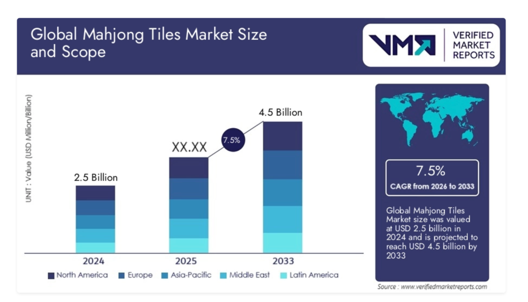 就全球市場來看,麻將運動處於快速增長階段。根據Verified Market Reports今年三月刊登的研報,全球麻將牌市場規模在2024年為25億美元,預計2033年將達到45億美元,2026年至2033年的複合年增長率為7.5%。其中,亞太地區不僅市場份額最高(在2023年達到近50%),而且增速也最快。
