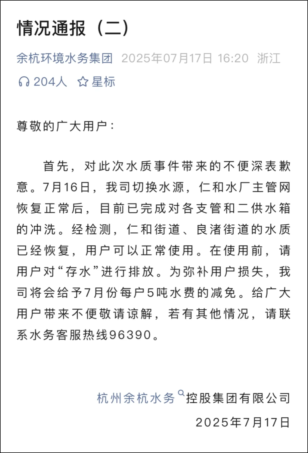第一份裏説,仁和和良渚街道部分區域的自來水確實有異味。