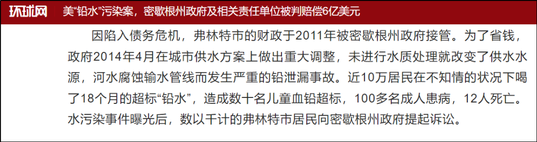 美國弗林特市的鉛水污染案裏,近10萬居民受影響,他們在不知情的狀況下喝了18個月的超標“鉛水”。