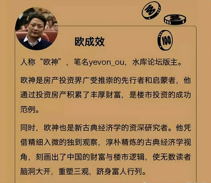 歐成效是復旦大學物理系2004年畢業生,進入社會後,他沒有選擇學術道路,而是敏鋭捕捉到了,城市化進程中的財富密碼。2008年,在全球金融危機期間,他藉着國家"四萬億"刺激政策的東風,以"三成首付+七成貸款"的槓桿策略,在上海瘋狂掃貨,購買了3、40套房子。2016年,他通過低價鎖定房源後高價轉賣的方式,就獲利2000多萬元。2015年,歐成效其創辦的水庫論壇,會員迅速突破了10萬,課程為2980元,還常被秒殺,粉絲們將他的"抵押-套現-再投資"的循環,奉為圭臬。
