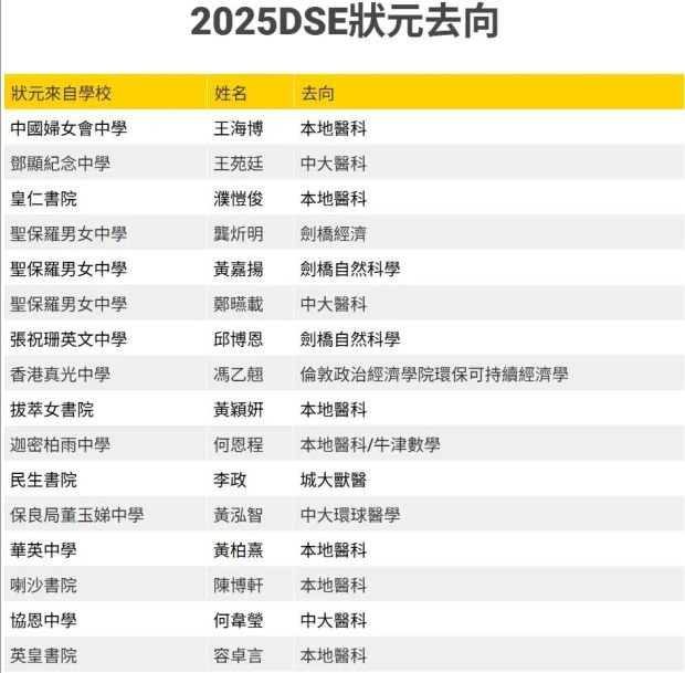 公開信息顯示,香港16名狀元中有11人計劃學醫,另有1人想學獸醫。同期公佈的“國際文憑大學預科考試”(IBDP)顯示,至少32名考生是“高分狀元”,其中多人要做精神科醫生、傳染科醫生等。香港大學李嘉誠醫學院透露,將錄取26位IBDP狀元。