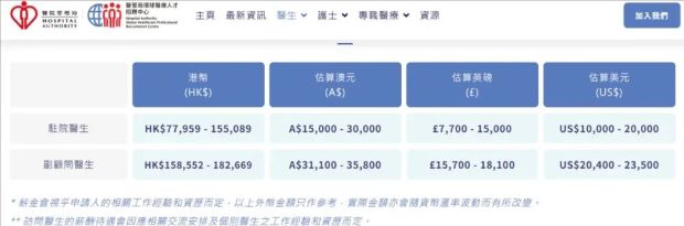 香港醫院管理局官網信息顯示,在公立醫院體系中,駐院醫師每月底薪和各類津貼合計7.7萬-15.5萬港幣(約合人民幣7萬-14萬)。晉升到副顧問醫生等中層,每月起薪約15.9萬港幣。這些都遠高於當地民眾的月均收入(2.4萬港幣)。