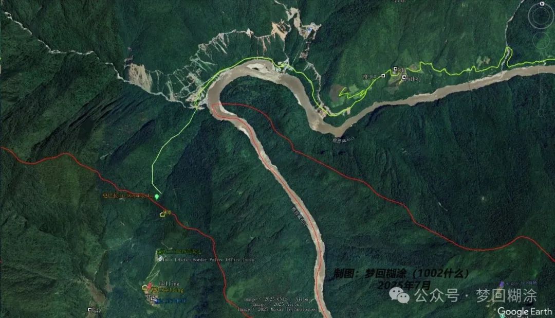 這是推測水電工程海拔最低處、水電站所在——雅魯藏布江瀘公河口實控線附近的大拐彎。不要拿果果塘的照片張冠李戴,它上面都是樹。