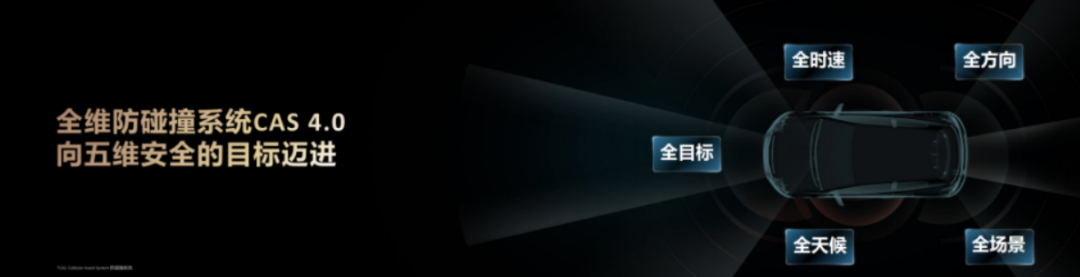 而當友商們還在卷 AEB 的生效時速、宣傳後向 AEB 功能的時候,智界 R7 已經可以依靠 CAS 4.0 實現五維安全防護了。在全時速(0-150km/h)、全方向、全目標和全場景下,都能憑藉強大的主動安全能力避免潛在的碰撞隱患。