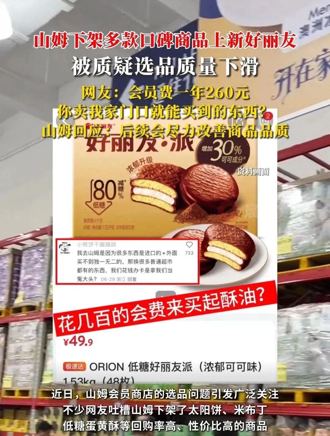 事情源於7月山姆產品換新季,公司集中下架了太陽餅、米布丁、低糖蛋黃酥等一大批高回購率,高口碑的超值網紅單品。取而代之的則是滿大街隨處可見的好麗友、溜溜梅、衞龍魔芋絲,還有徐福記。