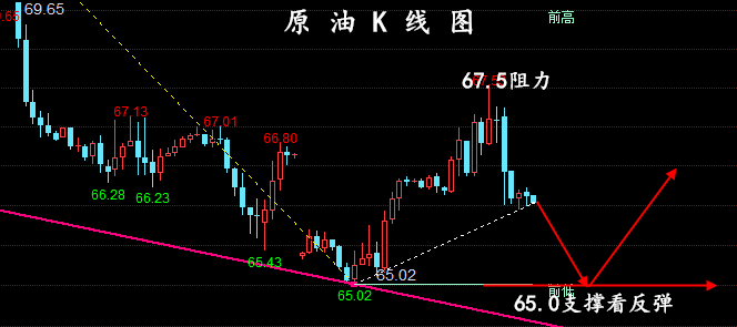 技術面:技術面上看,昨日國際油價震盪交投中迎來壓制下行回落。亞歐盤時段,原油價格依託66.0關口小幅企穩拉昇,盤中刺破67關口到達67.5附近承壓回落,晚間美盤接連下行並擊穿67.0-66.0整數關口,到達66.0附近弱勢收盤,日K線報收壓制回落反包大陰。4小時週期形成下降ABC的概率很大,B浪反彈可能接近尾聲。下週重點關注上方67.5阻力,下方65.0支撐!個人預計:高空為主,低多為輔;WTI分水嶺:66.0美元/桶!