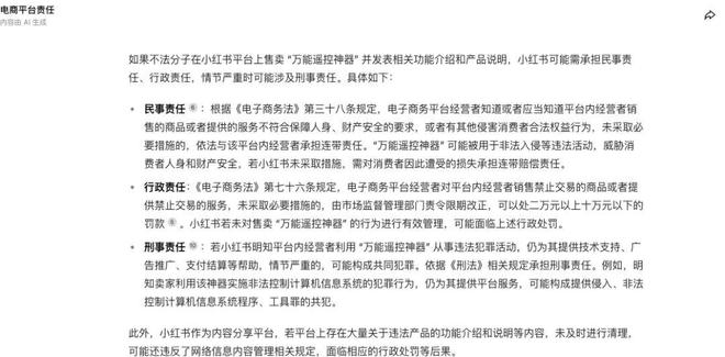 如果不法分子在小紅書平台上售賣“萬能遙控神器”並發表相關功能介紹和產品説明,小紅書可能需承擔民事責任、行政責任,情節嚴重時可能涉及刑事責任。具體如下: