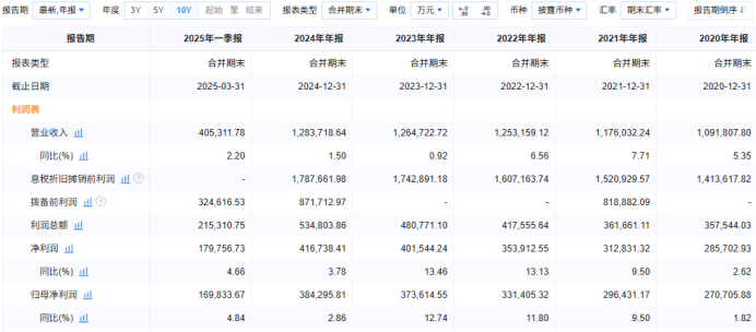 同期,江南農商銀行的歸母淨利潤也是非常不錯的,2020年至2024年歸母淨利潤分別為27.1億、29.6億、33.1億、37.4億、38.4億,同比分別增加1.82%、9.5%、11.8%、12.74%、2.86%,相比於2022年、2023年的兩位數增長,2024年增速明顯下滑,不過仍然保持了業內較高的盈利水平。