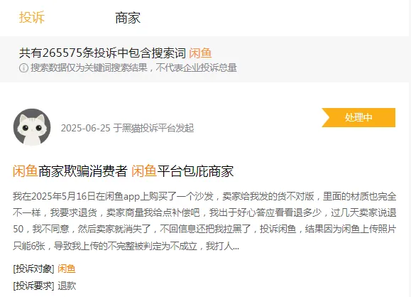 除此之外,口碑的破壞對閒魚品牌形象的長期影響是深遠的。在競爭激烈的電商市場中,良好的品牌形象是吸引用户的關鍵。但如今,閒魚在用户心中的形象已大打折扣,這使得它在與其他二手交易平台競爭時,處於明顯的劣勢。在黑貓平台上,關於閒魚的投訴就高達265575條,其中包含監管不嚴,售後無能,貨不對版等問題。
