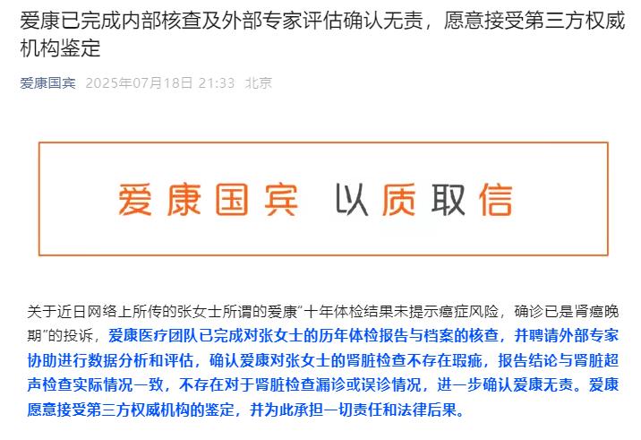 7月18日,愛康國賓在微信公眾號上二次回應稱,愛康醫療團隊已完成對張女士的歷年體檢報告與檔案的核查,並聘請外部專家協助進行數據分析和評估,確認愛康對張女士的腎臟檢查不存在瑕疵。