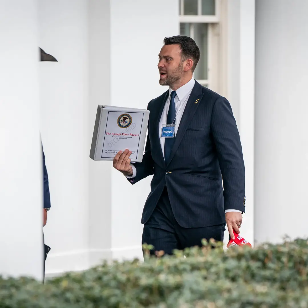 傑克・波索比克在白宮,手裏拿着一頂紅色的 “讓美國再次偉大” 帽子和一個標有 “愛潑斯坦檔案:第一階段” 的活頁夾。今年 2 月,包括傑克・波索比克在內的保守派活動人士受邀到白宮,領取了裝有愛潑斯坦案相關材料的活頁夾。後來他們抱怨説,裏面沒有任何新的爆料。