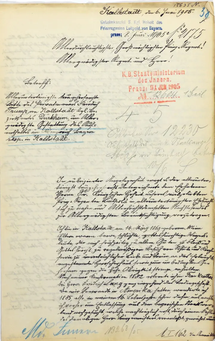 這段話出自弗里德里希·特朗普寫給巴伐利亞攝政王的一封信,2016年,歷史工作者羅蘭·保羅在德國萊茵蘭-普法爾茨州斯派爾市的檔案館中發現了它,落款為1905年2月27日。後來的故事已經廣為人知,弗里德里希最終還是被迫離開了德國,而他的孫子唐納德·特朗普於2017年和2024年,兩次當選美國總統。