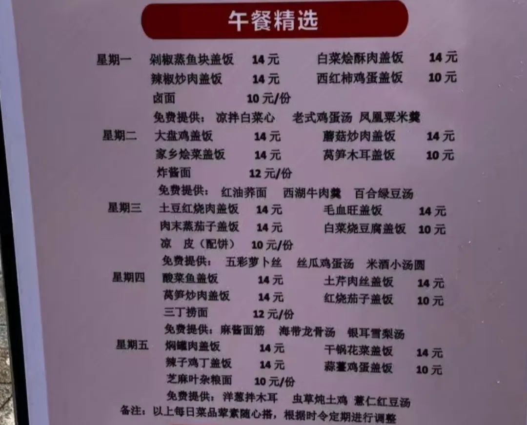 河南某星級酒店則主打平價工作餐,14元的蓋澆飯讓人夢迴工地大排檔,各種免費的涼菜與熱湯,更是極具性價比,可以跟外面的夫妻店掰掰手腕。