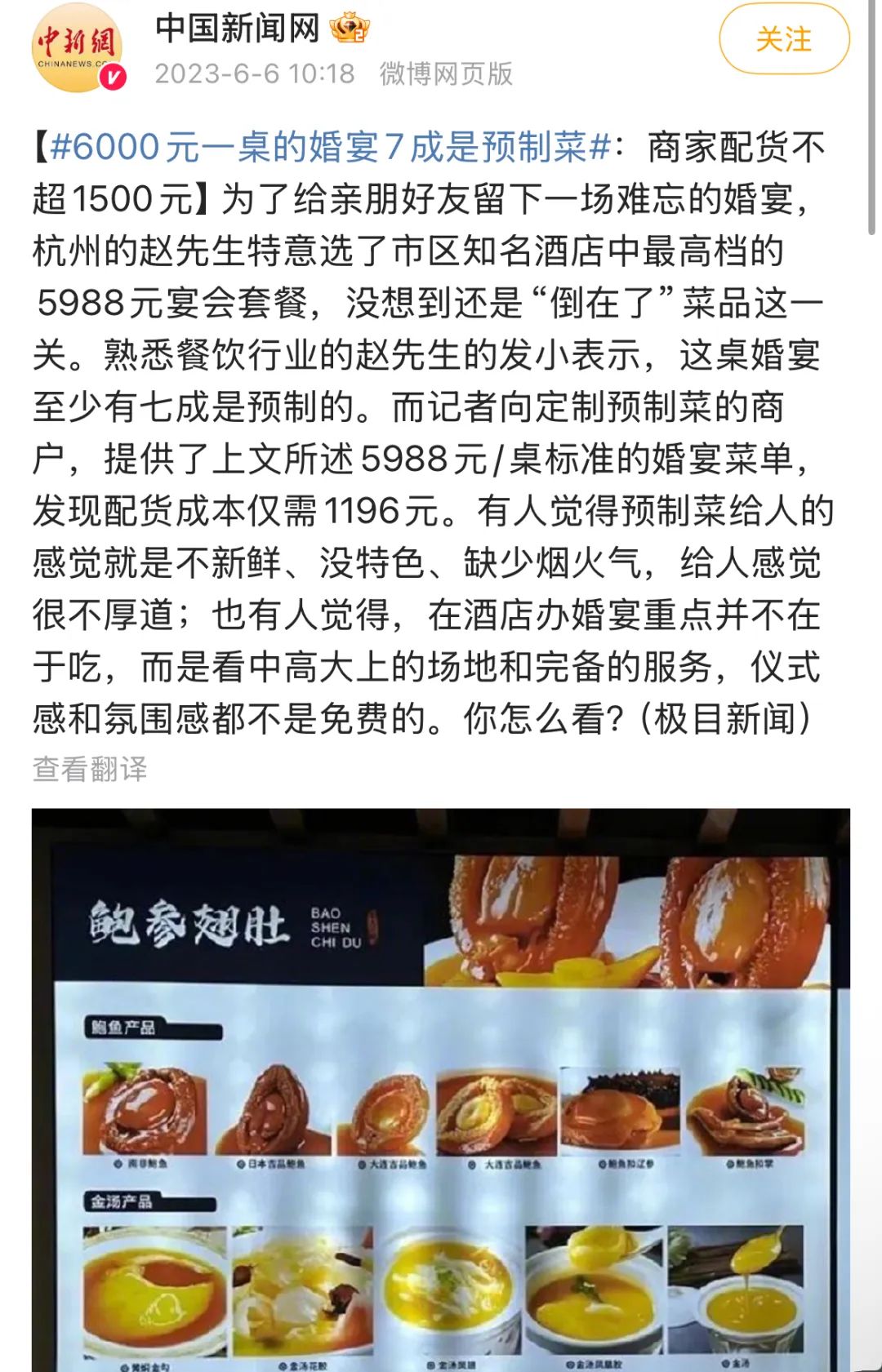2023年6月,杭州的趙先生為舉辦婚禮,特地選擇了當地某知名的高檔酒店,並預定了高達5988元/桌的婚宴。結果趙先生在婚禮現場發現,該高檔酒店提供的菜品中,有7成都是預製菜,堪比“花高價、買假貨”。