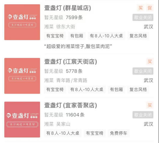 大眾點評數據則顯示,壹盞燈此前在武漢地區有6家門店,目前光谷店、夢時代店、經開永旺店仍在正常經營,與品牌公眾號數據一致;而位於羣星城、江宸天街及宜家聚會的3家門店目前為“歇業關閉”狀態。此外,壹盞燈位於深圳龍華壹方城的門店也顯示“歇業關閉”狀態。