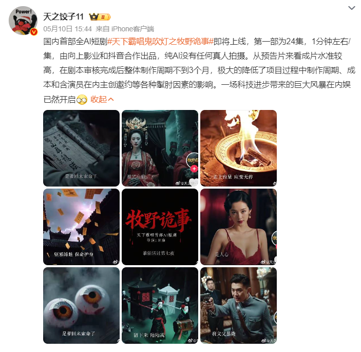 目前,業內已有平台和團隊開始嘗試IP與AI短劇的結合。比如掌閲近期推出的《遮天》,被視為首部將AI技術與實拍結合、完成大IP微短劇化改編的代表案例,根據天下霸唱原著改編的AI短劇《牧野詭事》也即將上線。這些項目都在驗證着,AI短劇正在嘗試藉助熟悉的IP框架,切入更大的產業鏈條。