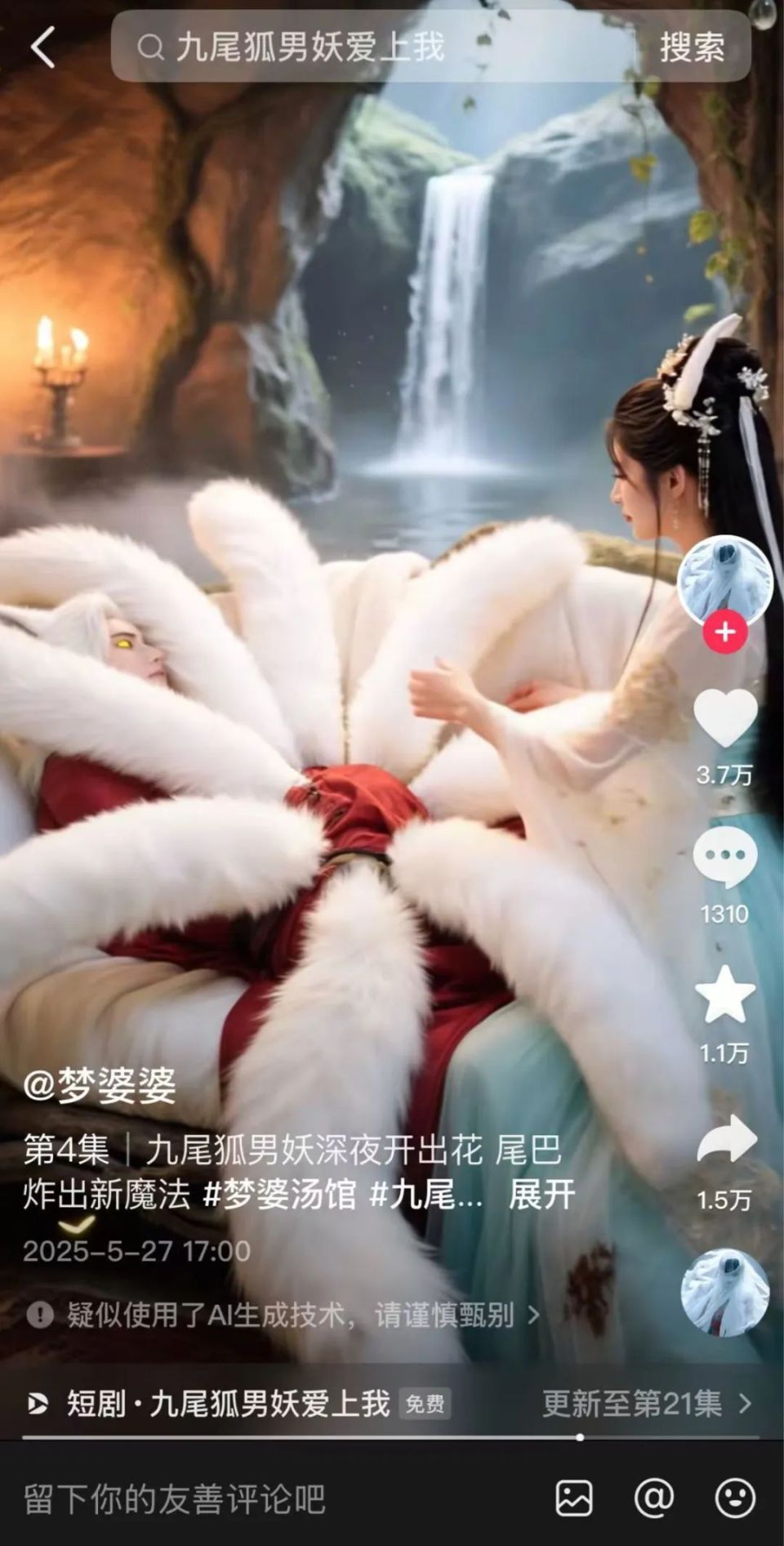 目前這部名為《九尾狐男妖愛上我》的AI短劇,目前更新至第21集,抖音播放量超1.2億,進入抖音&快手在播短劇熱度周榜前20名。
