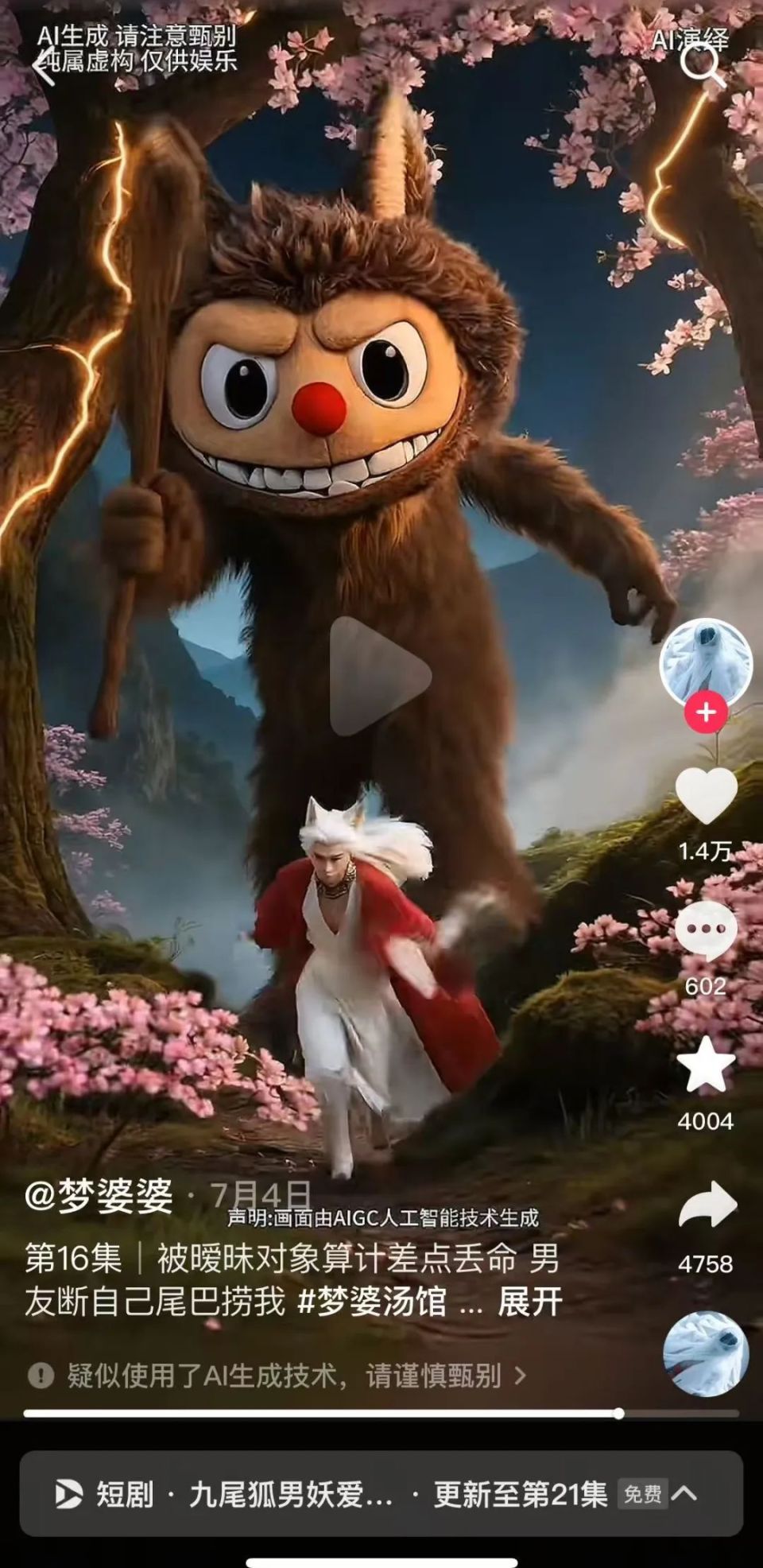 如果你最近在短視頻刷到邪惡龍女燉鹿角湯、吃可愛小妖精,還放Labubu出來對付男主的奇葩視頻,不要驚訝,AI短劇的確已經癲到超出認知了。