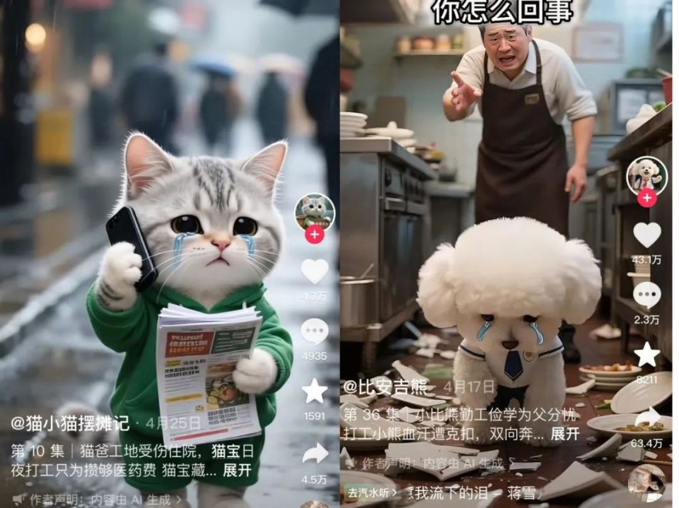 動物擬人化的AI短劇源於對國外視頻平台熱門視頻的搬運模仿,並迅速在抖音、快手擴散成內容風潮,其中最具代表性的是《貓小貓打工記》系列,其播放量已超1.4億。劇中的小貓小狗不僅能完成情緒表達,還被賦予了“權謀女主”“打工社畜”等人設,催生觀眾共情,達到和刷短視頻、看短劇類似的解壓效果。