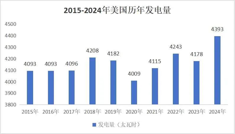 從歷年數據看,2015年,美國發電量為4093太瓦時;2024年,美國發電量為4393太瓦時;10年間,只增長了7.4%。