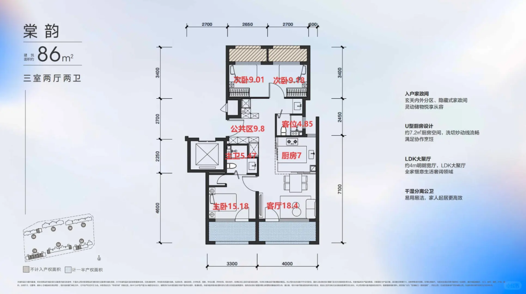雖然顯示建面比69㎡户型大了17㎡,但實際排下來就多了個廁所,感覺尺度感上,沒有和前者拉開差距。