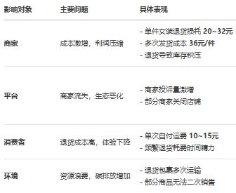 高退貨率對商家造成了巨大壓力。每件女裝退貨會造成約20至32元的綜合損耗,包括運費、商品折舊、倉儲及人工處理成本 。一位女裝店主算過一筆賬,一件衣服平均來回發3次,單次快遞費4元,運費險4.8元,包裝費1.2元,重新熨燙加人工費2元,單次發貨成本就達12元,發貨三次成本最低36元。這還不包括被穿過弄髒無法二次銷售的損耗。