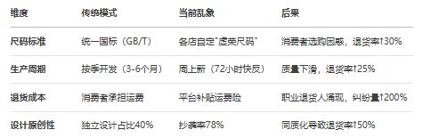 平台流量分配機制加劇了商家的同質化競爭。為追求利益最大化,平台瘋狂壓榨商家提高轉化率,而提高轉化率最"快速"的兩條路,無非是製造爆款、以量取勝,或是打價格戰、用低價劣質產品吸引眼球 。原本個性鮮明的服裝行業,就這樣被逼上了同質化、低質量的絕路。商家淪為流水線上的生產機器,生產着毫無靈魂的"爆款”;消費者則深陷"買家秀"與"賣家秀"的巨大落差中,最終形成了"商家賺不到錢,消費者陷入’買—退—買’循環"的行業悲劇 。