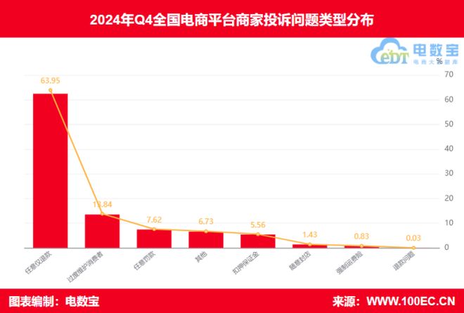 電商平台規則的不平衡是推高退貨率的關鍵推手。2021年,拼多多率先推出"僅退款"規則,隨後淘寶、京東、抖音、快手等平台相繼跟進。這一規則本意是為消費者提供便捷的售後保障,卻在執行過程中被濫用。據"電訴寶"顯示,2024年Q4全國電商平台商家投訴問題中,“任意僅退款"佔比高達63.95%,排在第一位 。