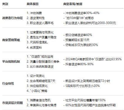 商家營銷策略的過度化與同質化是推高退貨率的重要原因。為爭奪流量入口,女裝商家不得不在營銷上投入大量資源。一位女裝店主透露,“我們店主打的就是低價多銷,主要在樣式上下功夫,讓消費者在夏天能有更多款式的T恤可穿,説白了,穿一兩次拍拍照就行。” 即便如此,其女裝店退貨率仍**達到了60%**左右。商家在流量爭奪中被迫採取"以量取勝"的策略,卻忽視了產品質量和消費者體驗。