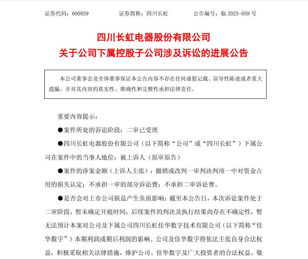 四川長虹表示,截至公告日,此次訴訟案件處於二審階段,開庭時間尚未確定。後續案件的判決及執行結果存在不確定性,暫時無法預估對公司及下屬公司佳華數字本期利潤或期後利潤的影響。四川長虹及佳華數字將依法維護自身合法權益,積極採取法律措施。