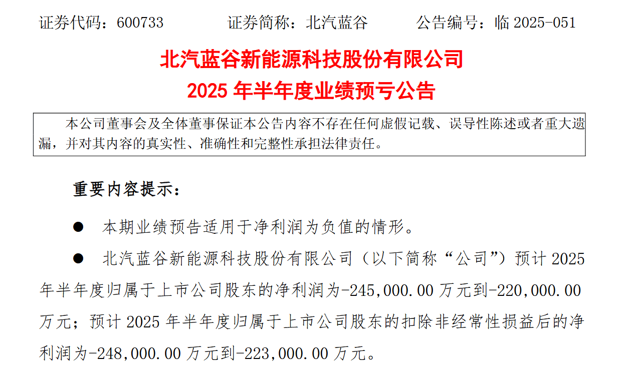 近日,北汽藍谷新能源科技股份有限公司(以下簡稱“北汽藍谷”)發佈了2025年半年度業績預虧公告,預計實現歸屬於上市公司股東的淨虧損22億元至24.5億元,較上年同期25.71億元的淨虧損有所收窄,但連續5年半累計虧損超300億元的現狀顯現出了其盈利困境。