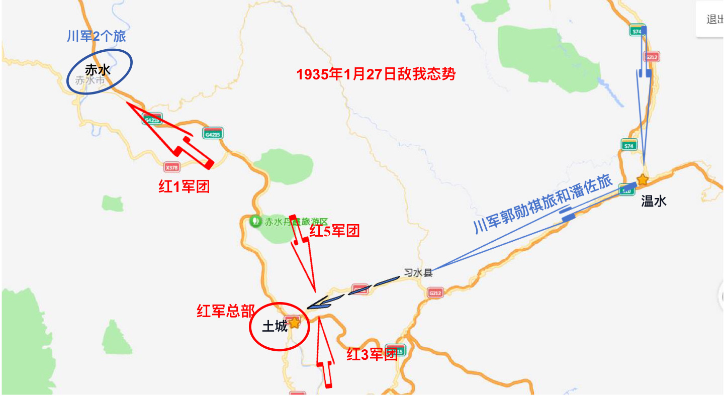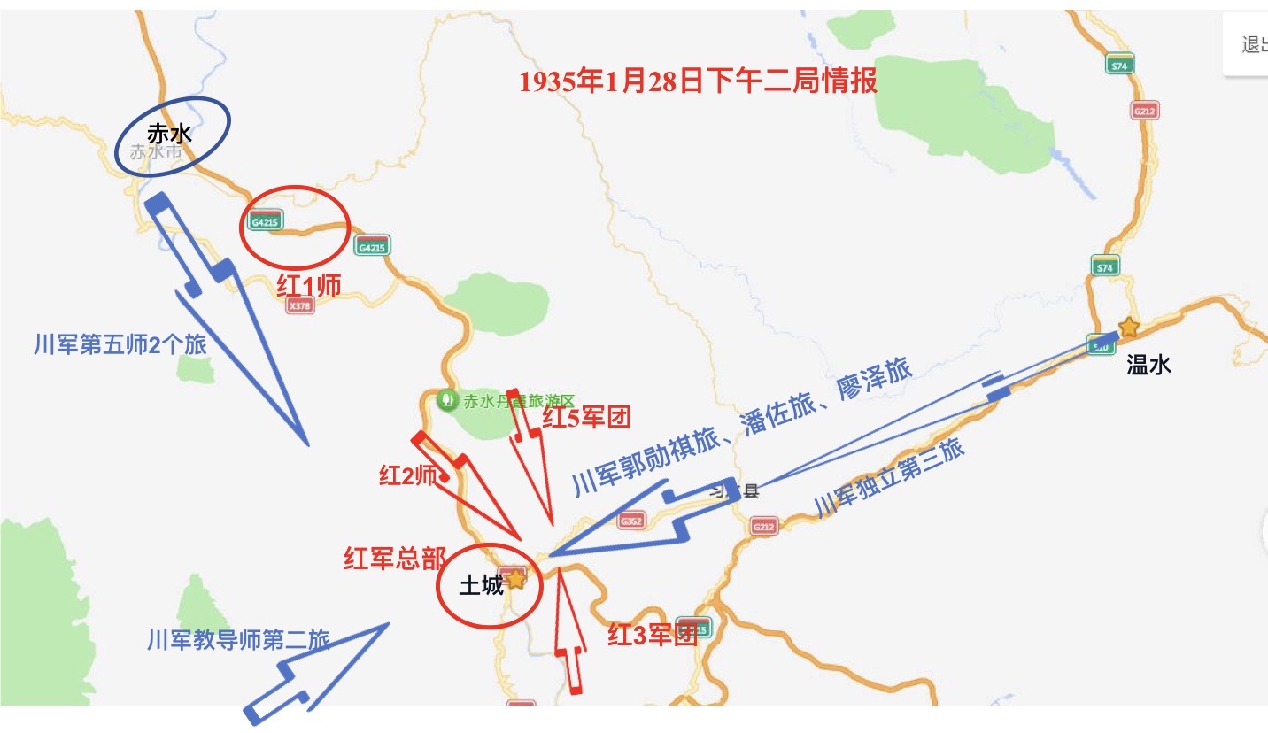3、1月24日,紅1軍團攻佔土城,26日到達赤水城郊,與先入城的川軍2個旅形成對峙。同日,二局截獲情報:川軍的郭勳祺旅和潘佐旅從四川江津南下,直插温水,尾追中央紅軍主力。27日,毛澤東、朱德、周恩來在去土城的路上,發現土城以東的山谷地帶是個合圍追兵的好地方。當時以為按常規編制每旅2個團,川軍2個旅4個團,兵力5000人左右。我紅3、5軍團合計1萬餘人,兵力上佔有優勢。毛澤東當即下令紅3、5軍團佔領土城以東青槓坡兩側有利地形,準備痛擊尾追的川軍,解決紅軍腹背受敵的困境(見圖1)。