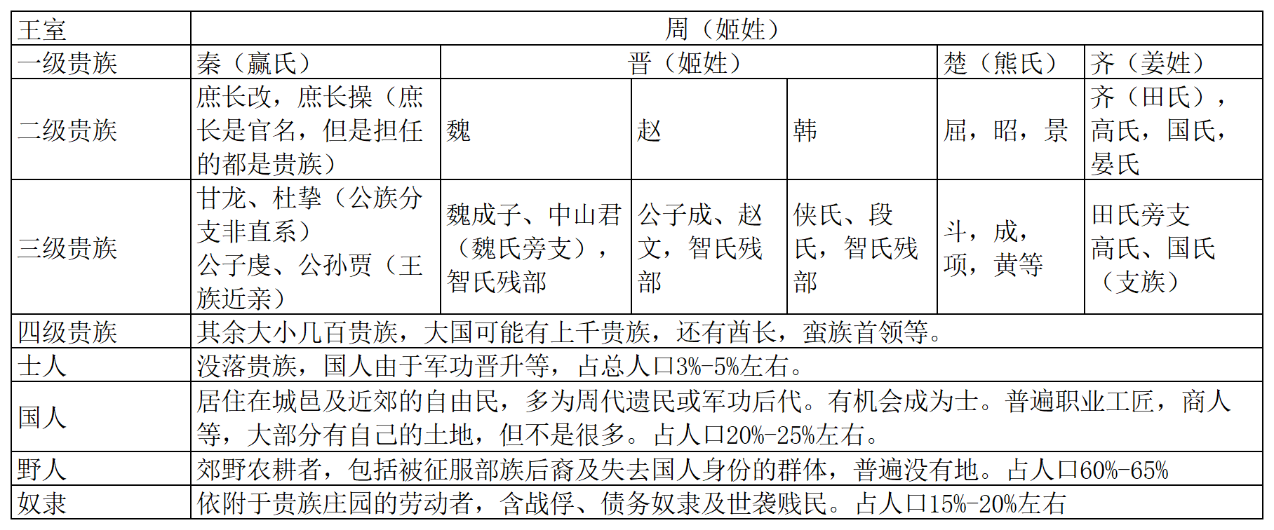 第一重封印是封建制。西周把人分為了6個層次,跟今天的印度差不多。我們這裏簡化一點,只討論普通平民的3個層級。也就是説,非貴族和士外的所有人(總人口大概95%-98%),被分為三個等級,最高級是國人,第二級是野人,第三級是奴隸。這種區分,是寫在西周的歷法裏面的,是法律上面的明確區分。這個階級總表,到1949年前還是存在的,只不過裏面的人換了名字而已。