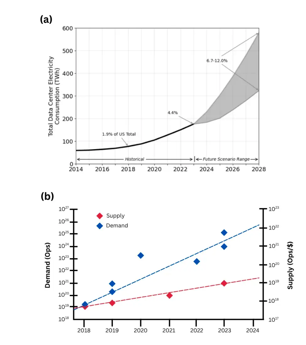 圖 1. 預計的計算能耗與計算能力供需情況。雖然“計算危機”有多重面向,但兩個關鍵方面是:(a)計算能耗的不斷上升;(b)計算能力供需差距的不斷擴大(此處以 AI 模型訓練為例)。過去幾年中,這兩個問題在很大程度上都是由 AI 革命所驅動的。圖中(a)和(b)分別改編自參考文獻 [3] 和 [4]。