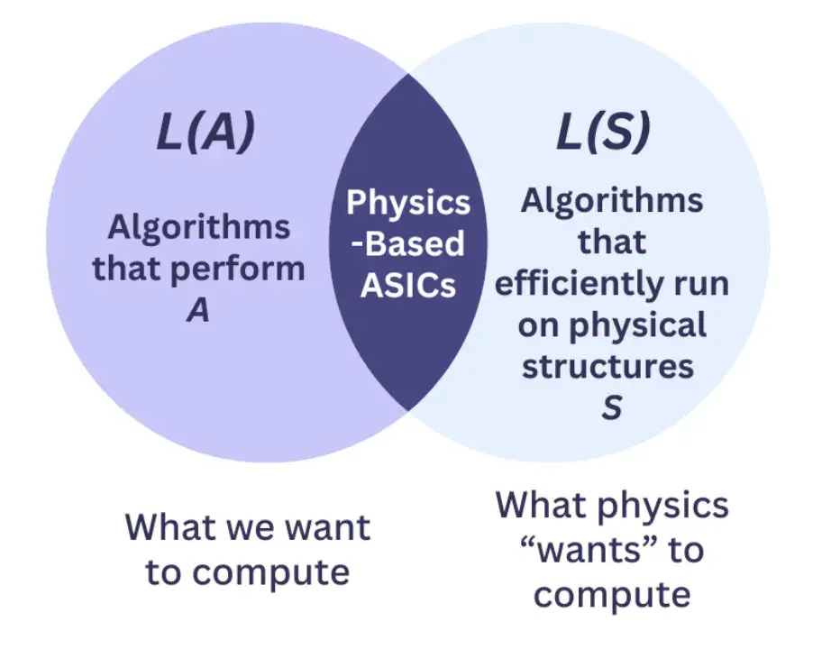 圖 4. 基於物理的ASIC設計。 自上而下方法給出可運行目標應用 A 的一組算法 L(A)。自下而上方法給出可在某種物理結構 S 上高效運行的一組算法 L(S)。基本設計原則是最大化這兩組算法之間的重疊。