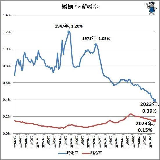 2023年日本的結婚人數為47萬多人,結婚率僅有0.39%,2024年的結婚率甚至降到了戰後第二低。年輕人牴觸結婚,出生率自然也隨之下降。