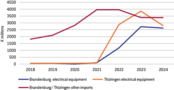 資料來源:Destatis。注:儘管開工較早,但圖表顯示,直到 2021 年,進口量仍然温和,這表明大部分設備進口並非發生在早期建設期間,而是發生在調試和生產啓動的最後準備階段。這與典型的項目開發週期一致,在 2022 年和 2023 年投產之前,在運營前爬坡的最後階段安裝高價值機械和電氣部件。