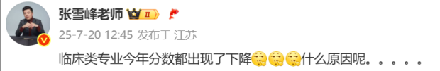 就臨牀醫學等專業而言,7月20日,教育大V“張雪峯老師”在微博公開表示,“臨牀類專業今年分數都出現了下降……”